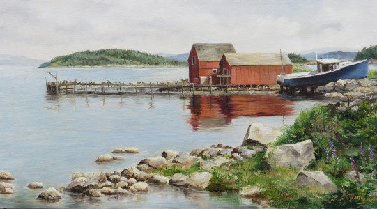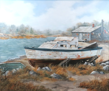 A foggy morning greets us as we view the shore of a Nova Scotia harbor. A red and white fishing boat is dry-docked ashore near a boathouse with a dock and dinghies. Oil on canvas by renowned fine artist, Dan Gaudette.